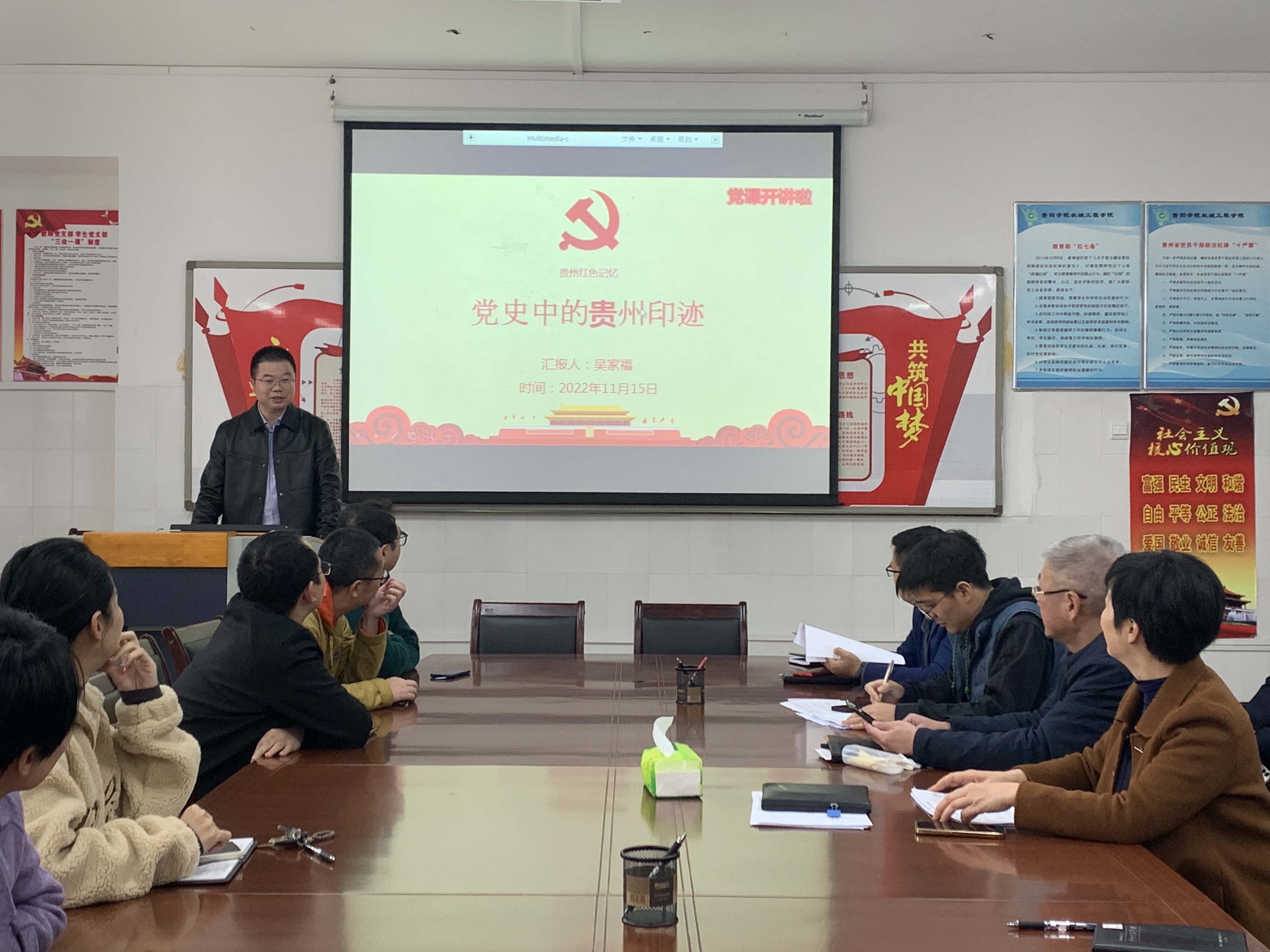 2022年11月15日,永利3044noc吴家福副经理在C203党员活动室,为全体教师党员上了一堂“党史中的贵州印迹”的专题党课。